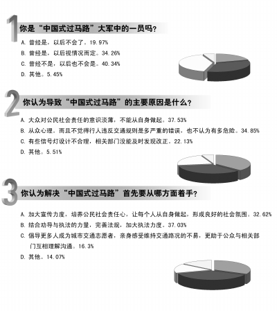 ■ 本報記者 張雪弢 近日,網友“這個絕對有意思”發布了這樣一則微博:“中國式過馬路,就是湊夠一撮人就可以走了,和紅綠燈無關。”微博配圖中,雖然從照片上看不到交通信號燈,但有好幾位行人并沒有走在斑馬線上,而是走在旁邊的機動車變道路標上,其中有推著嬰兒車的老人,也有電動車、賣水果的三輪車。 這條微博引起了不少網友的共鳴,一天內被近10萬網友轉發。經央視等媒體報道后,再次引爆網絡。 有評論說:“只要一個人敢帶頭闖紅燈,剩下的人就跟著一起了”的現狀,透露出群眾對規則缺少敬畏心理,“法不責眾”的思想也在人們心里根深蒂固,“群膽效應”的后果就是集體違章。網友建議,要治好“中國式過馬路”的“暗傷”,就得下“猛藥”,結合城市實際,制定相適應的獎懲制度,做到有法可依,運用執法的力量,加大處罰力度。 然而,行人不論“紅綠燈”搶著過馬路僅僅是行人的素質問題?加大懲罰就可以解決問題?《公益時報》與搜狐公益聯手推出的“益調查”結果顯示,40.34%的網友表示不曾是“中國式過馬路”大軍中的一員,并且以后也不會是;37.53%的網友認為導致“中國式過馬路”的主要原因是:大眾對公民社會責任的意識淡薄,不能從自身做起。 調查結果: 本次調查從10月19日14時至10月21日22時,共有6191位網友參與調查。 “益調查”結果顯示,40.34%網友明確表示,以前不是“中國式過馬路”大軍中的一員,以后也不會是;34.26%的網友則表示曾經是,以后是不是也要視情況而定;19.97%的網友表示,曾經是“中國式過馬路”大軍中的一員,但以后不會了。 在大家心中,導致“中國式過馬路”的主要原因是什么呢? 參與調查的網友中,37.53%的網友認為“大眾對公民社會責任的意識淡薄,不能從自身做起”導致了“中國式過馬路”的產生;34.85%的網友則認為是從眾心理,并且這樣過馬路的人不覺得行人違反交通規則是多嚴重的錯誤,也不認為有多危險;同時,也有22.13%的網友認為有些信號燈設計不合理,相關部門沒能及時發現改正。 那么,解決“中國式過馬路”首先要從哪方面著手? 37.03%的網友認為,要結合勸導與執法的力量,完善法規,加大執法力度;32.62%的網友則表示,應該加大宣傳力度,培養公民社會責任心,讓每個人從自身做起,形成良好的社會氛圍;也有部分網友選擇了“倡導更多人成為城市交通志愿者,親身感受維持交通路況的不易,更助于公眾與相關部門互相理解溝通。” |