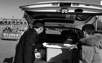 2020年2月2日,在寧夏鹽池縣青銀高速公路花馬池出入口野生動物檢查點,工作人員檢查即將駛出的車輛